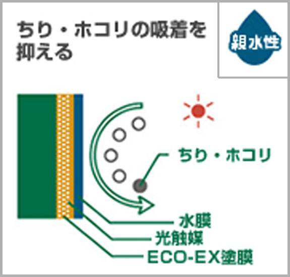 光触媒の親水性により、塗膜表面に水膜をつくり建物への帯電(静電気)を防ぐので、ちりやホコリ等の汚れがつきにくくなります。